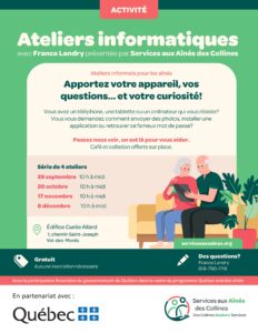 Animés par France Landry et offerts par Services aux Aînés des Collines, ces rencontres conviviales vous permettent d’apporter votre appareil, vos questions… et votre curiosité ! Que ce soit pour envoyer des photos, installer une application ou mieux comprendre votre appareil, nous sommes là pour vous aider, pas à pas.