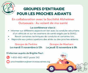 Vous accompagnez un proche vivant avec l’Alzheimer ou une autre maladie cognitive ? Venez échanger, vous informer et prendre soin de vous lors de nos groupes d’entraide animés par Services aux Aînés des Collines. En novembre, nous proposons la conférence « Au volant de ma santé » en collaboration avec la Société Alzheimer Outaouais.