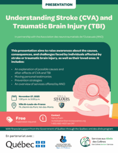 On November 27, join us for a free conference organized in partnership with the Association des neurotraumatisés de l’Outaouais (ANO). Together, we will explore the causes, consequences, and support services related to stroke and TBI.
